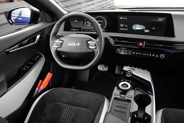 Az óriásbébi külsejű autó belsejében is döbbenetes méretű a hely. Egy hagyományos autóhoz képest a padló szokatlanul magasan van, viszont a legtöbb villanyautóhoz hasonlóan teljesen sík, emiatt hátul középen valóban normálisan lehet utazni. Egyszerűen nem kérdés, hogy elfér-e valaki hátul, még akkor sem, ha magas sofőr/anyós mögé kell beülni. Inkább lélektani különbség a Hyundai Ioniq 5-höz képest, hogy kevésbé érződik szellősnek a Kia belseje: elöl azért, mert a tetőoszlop és a szélvédő laposabban áll, illetve a két első ülés közé egy emeletes tárolórendszert építettek be, ami elszeparálja a két elöl ülőt.