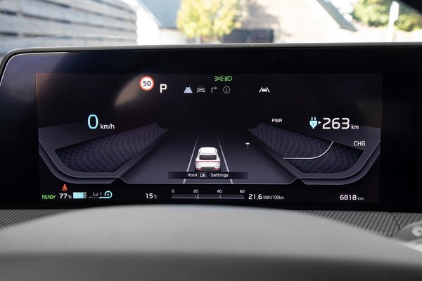 Eco üzemmódban meglehetősen leszedálódik az EV6, illetve mélyebbre kell nyomni a gázt ugyanolyan gyorsításhoz. A visszatáplálás erőssége a kormány mögötti fülekkel szabályozható 3 fokozatban, a negyedik lépcső pedig az egypedálos használat, amikor szinte csak vészfékezésre kell használni a valódi féket, amúgy a gáz finom elvételével már erősen lassít az autó, sőt, finoman meg is áll. A Kia fékje meglehetősen normális pedálérzettel működik, holott a hatalmas féktárcsák csak akkor kapcsolódnak be a lassításba, ha már a generátorüzembe kapcsolt motorok nem lassítanak eleget az autón. A vezetősegítő rendszerei, mint például a sávtartó, egész meggyőzően működtek a dániai közlekedésben, de majd egyszer kipróbálnám, mit tud a kopott festésű magyar sávokkal kezdeni.