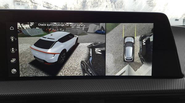 Van néhány kifejezetten zseniális ötlet az autóban, de ahogy gyorsan összenézegettük a funkciókat, ugyanazokat találtuk, mint a Hyundai Ioniq 5-ben. Például a 360 fokos kamera, csodálatos madártávlati képen lehet nézni manőverezés közben a képét, bár az autó, amit látunk, az természetesen egy 3D-s grafika, amit fogathatunk, és vele együtt a környezet képe is forog. Viszont ha már az oldalsó tükrök alján van kamera, miért ne használnánk máskor is? Az autó indexeléskor automatikusan beadja a kamera képét a vezető előtti 12 colos kijelzőn, így például az ember látja a járdaszegélyt, és nem padkázza le.