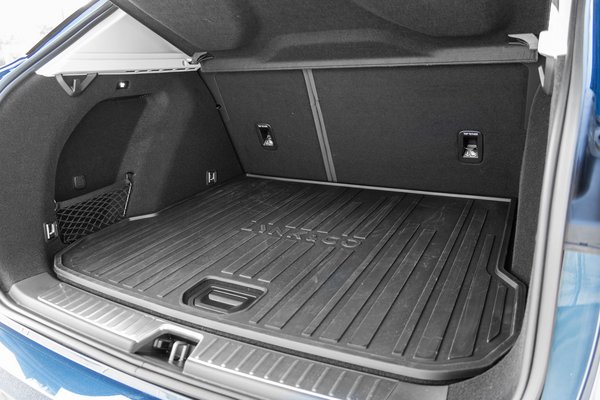 Praktikus szempontból is megállja a helyét, egy észrevétellel. Az utastér a 273 centis tengelytávnak és a 170 centis magasságnak is tulajdoníthatóan tágas és szellős, négy utasnak mindenképpen kényelmes, de akár ötnek sem kell különösebben szűkölködnie. Ötfős utazás esetében azonban jól meg kell gondolni a csomagolást, mert a csomagtartó alaphelyzetben nem túl nagy. Bár a hivatalos adat szerint 509 litert lehet belepakolni, a padló és a roló közötti térfogat csak körülbelül 380 liter. A padló alatt valójában lenne még bő 120 liter, csakhogy annak a közepére tették a 12 voltos akkumulátort. Letakarták ugyan egy középen az akkumulátor formáját lekövető kárpitdarabbal, de ettől még mindig csak egy gyűrűszerű hely maradt, ahová legfeljebb a töltőkábeleket lehet betenni. Az emiatt magas fekvésű padló egyedüli pozitív következménye, hogy a csomagtartó bővítésekor, a háttámlák előredöntése után sík aljú raktér alakul ki.