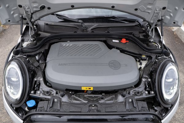 A legtöbb elektromos autó magasabb az átlagnál, mert az utastér alatt még kell hely az akkumulátornak. Az eszméletlenül cuki Honda E például 151 centis, az i3 pedig 160 centire nyújtózik, a Cooper SE azonban pont ugyanúgy csak 143, mint benzinmotorral. És nem csak a magasságuk egyezik, hanem minden más is, mert a Mini úgy oldotta meg a villamos hajtáslánc beépítését, hogy az semmilyen módon nincs hatással a kocsi többi részére. A motor, az inverterrel és egyéb sallangokkal elöl lakik a benzines hajtáslánc helyén, az akku pedig a kardánalagútban és a hátsó ülés alatt kapott T alakú helyet, ahol egyébként a benzintank lenne.