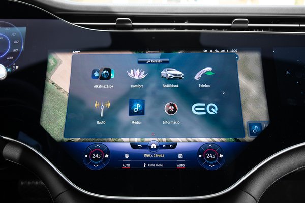 A jelenlegi csúcsmodellben alapfelszereltség a Hyperscreen, az olcsóbbakhoz viszont 3,6 millió forintos opció. Alapból a sima S-ből ismert kombó jár hozzájuk, amelynél az utas elé nem jut kijelző, csak a deszkát bámulhatja, mint holmi állatok az ólban. Az egybefüggő, finoman ívelt üvegfelület mutatós, torzításmentes, és 12 aktuátor gondoskodik a gombnyomás haptikus, tapintható érzéséért, a valódi gombokat sajnos nem helyettesíti. Vannak, akik panaszkodnak a négyzetméternyi felület csillogására, de engem pont nem zavart.