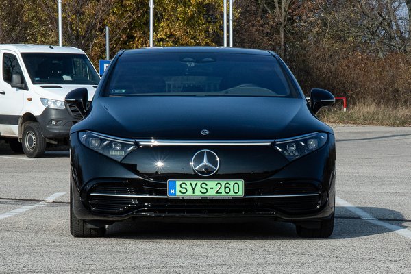 Arról is hosszan lehetne beszélgetni, hogy a Seamless Design nevében rajzolt külső mit közvetít, de azt hiszem, leginkább a levegőt. A légellenállási együtthatója szériaautók között rekordalacsony, 0,20 cW, de nem olvastam még olyan nyilatkozatot, hogy valaki kimondottan a formaterve miatt kívánt volna rá az EQS-re. Mindent a funkciónak vetettek alá, így annyira áramvonalas lett, hogy még a tekintet is lecsúszik róla; a megszokott Jelenlét híján az S osztály mellett pedig egyenesen láthatatlan. Úgy is viszonyul hozzá, ahogy a motorháztetőre simuló embléma az álló Mercedes-csillaghoz . Ez persze nem feltétlenül baj. Meg kell hagyni, a tesztautó kontúrtalan feketéje nem segít rajta, talán ez a legkevésbé előnyös szín hozzá, a világosabb árnyalatok vagy az 5 millióért rendelhető kéttónusú fényezés sokkal jobbat tesz neki.