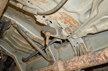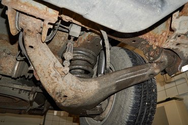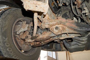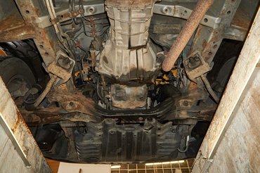 Alulról az is látszik, hogy az első futómű torziós rugóit valószínűleg már cserélték, ezeket amúgy állítani is lehet. Az alsó lengőkarok már sokat kaptak az élettől, ha ez valami sportos szedán vagy pláne kupé lenne, talán a lengőkar-cserét fel is írnám magamnak, de nem véletlen nem csinálták meg a lengéscsillapítókkal együtt: most még nem szükséges. Teszem hozzá, hogy az első kettős keresztlengőkaros, hátsó haránt lengőkaros független felfüggesztés meglehetősen igényes, sok sportautó jár egyszerűbb megoldással. Szóval ez az a fajta teherautó, amiből sem az anyagot, sem a műszaki gondolkodást nem spórolták ki.