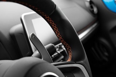 Tömegközépponthoz és az aszfalthoz közel ülni mindig remek, főleg ilyen bőrbe és alcantarába húzott kagylóülésekben. Rám borulnak a tükröződést megelőző fekete tetőoszlopok, előttem a sárvédők dombjai az ablakon túl, kattan az öv, megnyomom a középkonzolon a D gombot és rámarkolok a kis sportkormányra. Innentől egészen addig le se vettem róla, ameddig ki nem fogyott az utolsó csepp benzin.
