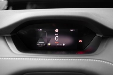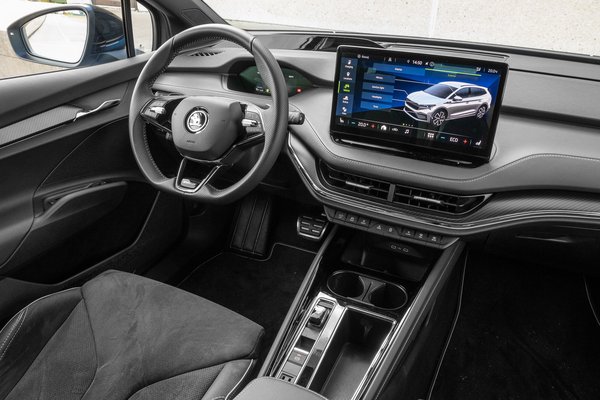 A hagyományokhoz ragaszkodás belül is meglátszik rajta. Nem egyetlen hatalmas érintőképernyőre épül a tájékoztató, szórakoztató és kezelő és rendszere, mint a Tesla Model Y-é, vagy kettőre, mint a Hyundai Ioniq 5-é. Egy olyan 33 centi átlójú érintőképernyő ül a műszerfal tetején, amilyet hagyományos hajtásláncú autókban is látni. Az alapján lehet inkább rájönni, hogy az Enyaq a szép új elektromos világ szülöttje, hogy van ugyan a vezetővel szemben műszeregység, de csak egy nagyon apró. Olyan kicsi, amin nem is férne el egy rendes fordulatszámmérő, ami elektromos autókban ismeretlen műszer. Nem is tud mást mutatni, mint az alapinformációkat.