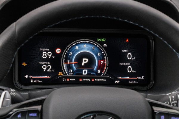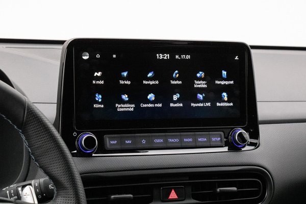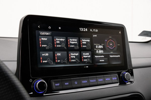 10,25 colos érintőképernyője mögött lassan bootol be a fedélzeti rendszer és van egy teljesen felesleges főképernyője is, de utána egy jól használható, logikus felépítésű menü következik. Vezeték nélkül tölti a telefont, de az Apple CarPlay-hez mindenképp kell drót, másképp csak Bluetooth-on működik a kihangosítás és a zenélés. Ahogyan a plug-in hibrid Kia Ceed-ben, úgy a Kona N-ben is nagyon jó volt a navigációs rendszer, ami gyorsan tervezett utat és egyértelmű utasításokkal, nagyon részletes ábrákkal terelget.