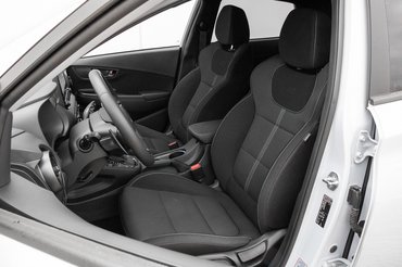 Váltókarja körül sorakoznak a kormány- és üésfűtés gombjai, a gyorsan felmelegedő nyeregnek és karimának pedig nagyon tudtam örülni, amikor a hidegből beültem a Kona N-be. Utasterében maradt elég hely fészkelődni és az együtt töltött 2000 kilométer alatt rendesen megkedveltem a sportos fazonúra húzott szövetkárpitos üléseit. Az üléspozíció viszont olyan, mintha nagyanyámnál pucolnék krumplit a konyhai széken.