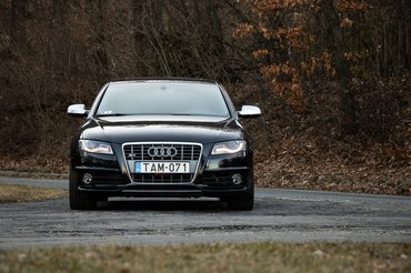 5,3 másodperc kell neki 100-ig, de közben annyi tónusban trombitál a négy kipufogó, hogy akár lehetne hosszabb is, az sem zavarna. Harmincötdét megettem vele múltkor, mondjuk nem vagyok benne biztos, hogy tudott a versenyről. Máskülönben kinőttem már a futártempóból. Meg rendes állandó összkerék ez, Torsen differenciálművel, szóval ezt a kilövést atombiztosan tudja télen és nyáron, száraz úton és jegesedett havon is, mindegy neki. Szerpentinen egészen más élvezet, mint egy 3-as BMW, mert az S4 futómű feszes, kormányzása tűpontos, csak éppen sokkal sterilebb. Irányt mutatok, a gázpedállal belövöm a sebességet, az Audi pedig megoldja, addig grammolgatja a 440 Nm-t, amíg könyörtelenül el nem fordul. Ilyenkor azért kaphatnak a Pirellik, mégis 1,7 tonnával szkanderozik a fizika.