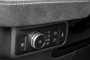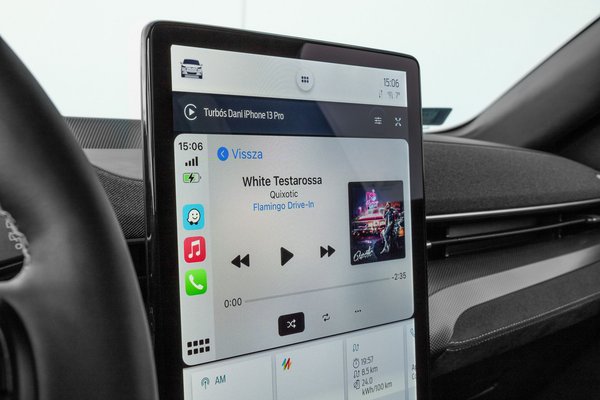 Látványos és alapvetően jó ötlet a hatalmas érintőképernyős tablet a középkonzol helyén, de nehéz olyan pozíciót találni, ahonnan kényelmes kezelni. Talán, ha nem függőlegesen állna, hanem megdöntenék vagy esetleg hajlított lenne, akkor jobban kézre esne. Így leginkább az tudja jól kezelni és látni, aki a hátsó pad közepén ül. A mögötte futó rendszer is lassan, akadozva bootol be, de aztán egyértelműek a különböző menüpontok. A kijelző tetején ott trónol az Apple CarPlay (vezeték nélkül), alatta néhány digitális csempe, majd a kétzónás klíma virtuális panelje az integrált tekerőgomb mellett.