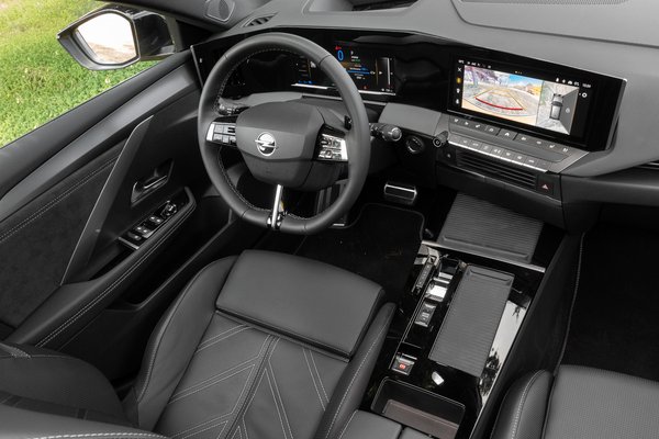 Belül is inkább a határozott vonalak érvényesülnek, szintén alig látni nyomát bármiféle közösködésnek. A szemfülesek azért kiszúrhatják, hogy az új Astrák mindegyikében Peugeot eredetűek a bajuszkapcsolók, ami egyúttal az Astrában is búcsút jelent az Opel németes hagyományt követő, a műszerfal bal oldalán tekerhető fényszórókapcsolótól – innentől a bal bajusz végének tekergetésével lehet a fényszórókat ki és bekapcsolni. Egy másik, kevésbé feltűnő elem a könyöklő, aminek teteje hosszában megosztva nyílik kétfelé, csakúgy, mint a Peugeot 308-asban (és például a Mercedesekben). Ez a nyitásmód egyébként abból a szempontból jobb az egy darabban hátrahajthatónál, hogy nyugodtan nyitva hagyható, mert fékezéskor nem csapódik előre.