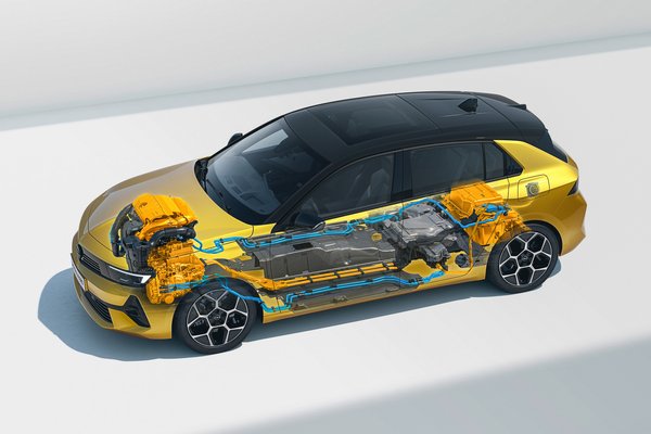 A francia kapcsolat nagy előnye, hogy mivel a Peugeot 308-ashoz is kínálnak konnektorról, azaz kívülről tölthető hibrid hajtásláncot, így a típus történetében először az Astrához is elérhető ilyen. Ennek alapja az 1,6 literes, négyhengeres, turbós benzinmotor 150 lóerős kivitele, ami többtárcsás, olajban futó tengelykapcsolón keresztül kapcsolódik a 110 lóerős elektromotort is magába rejtő nyolcfokozatú automataváltóhoz. A két motor kéz a kézben, azaz együtt 225 lóerő leadására képes. A rendszer 12,4 kWh kapacitású lítiumion akkumulátorral válik teljessé, amelynek egyszeri töltése városban papíron, azaz WLTP szerint 84, átlagban 60 km-re elegendő. A töltést azonban nem kapkodja el, az alaptöltő 3,7 kW-os, amivel a töltés időigénye 4 óra körül alakul. Felárért duplázható a teljesítmény, ami nagyságrendileg felezi a töltési időt. Később érkezik egy nagyobb 225 lóerős teljesítményű konnektoros hibrid is, abban – a 308-asból kiindulva – az 1,6 lóerős benzinmotor teljesítménye 150 helyett várhatóan már 180 lóerő.