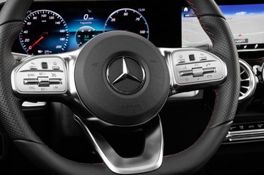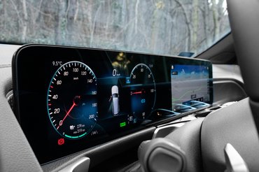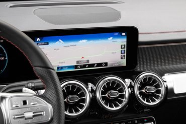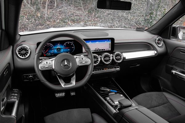 Műszerfalának központi eleme a Mercedes aktuális arculatához igazodva a két széles kijelző, melyek közül a kormány mögötti adja a digitális műszeregységet, a középsőn pedig az MBUX nevű okos fedélzeti rendszer fut. Az óracsoport klasszul variálható, sokféle nézetet kínál és a kormányon lévő érintőpaddal könnyen kezelhető, ugyanígy a másik tapipadról vezérelhető a főmenü is. A 10,25 colos kijelző képe szép és a hangvezérlése is természetesen működik, angolul hibátlanul megértette az olyan feladatokat, minthogy állítsa 21 fokra a hőmérsékletet, nyissa meg a navigációt vagy állítsa lilára a hangulatvilágítást. A rendszer gyors, egyértelmű a felépítése és még ebben az EQB-ban is hozza azt a meggyőző digitális élményt, amit az S 500-asban.