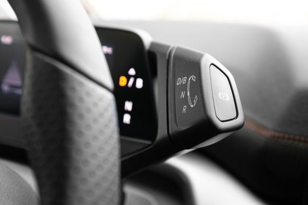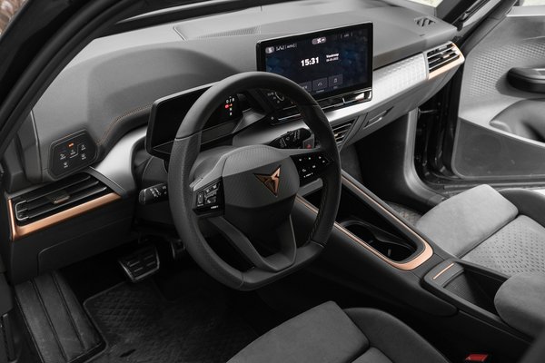 A Born esetében az ID.3 másik nagy hiányát is orvosolták: nem fáj nyitott szemmel beülni. Bár a drága részeken nyilván osztozik a testvérmodellel, így például a vezető előtti műszercsoport irányváltóstul ugyanaz, a világítás kapcsolócsoportja és a kormány kezelőszervei is stimmelnek. Kapott azonban saját kormányt, van rendes középkonzol, sportos, motorosan állítható és masszázsos kagylóülés. A díszítő elemeken is látszik a törődés, a formák koherensek, a háromszög motívum és a bronz szín is folytatódik odabent, utóbbit a varrás is viseli, finom. A súllyal és az árral persze muszáj spórolni, az ajtóbetét apró rácsos felülete ízlésesnek tűnik, közelről viszont olcsó és karcolódik, a szürke alcantara borítás ment valamit a helyzeten. Minimál, de létező minőségérzet uralkodik az autóban.