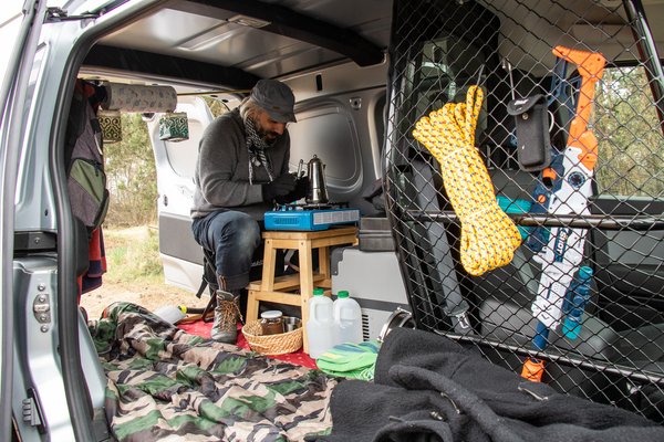 Az alvással kapcsolatban csak annyi a panaszom, hogy a hátsó 12 voltos port az ajtó mellé, és pont a hálózsákos oldalra került, így a kamionos hűtőt nem olyan egyszerű bekötni. Pedig amúgy remek kis konyhát tudtam kialakítani pár egyszerű eszközzel. Felegyenesdni nem lehet a Kangooban, de a helytakarékos kemping eszközökön ülve kényelmes a főzés, és a falon számtalan lehetőség adódik tárgyakat rögzíteni – akár fix polctól se riadnék vissza, ha saját autóm lenne.