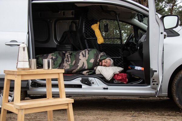 Azt hallom mindenhonnan, hogy a pecában már nem a Simsonra gumipókozott bot a menő, hanem az összkomfortos kitelepülés. Márpedig ha mondjuk a Tisza tó mellett akarok tábort verni, a Kangoo tökéletesen adja. És nem csak arra gondolok, hogy minden befér: az Open Sesame csomag része a nyitható raktérrács és vízszintesre buktatható utasülés, így kényelmes alvó sáv alakítható ki benne egy fő részére. Egy sima laticel, hálózsák meg valami jó párna elég a kényelemhez, és bár a tesztautóban nincs benne, a helyzetet tovább javíthatja a raktérbe rendelhető extra burkolat. Ez hullámos fém padló helyett sima fa felületeket biztosít, extra LED lámpákkal. Már szinte hipszter bulimobil!