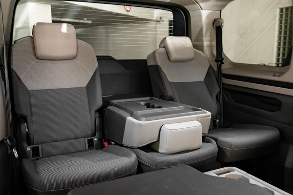 A középső üléssor két ülése nem sokban különbözik az elsőktől, viszont sajnos nem forgathatóak, mint az elődökben. Egyrészt nem kattannak be a sínbe, másrészt a biztonsági övek is a C-oszlopból indulnak. A két ülés között nagyon jópofa sziget, amiből kétfelé asztal nyitható, de simán csak pohártartónak is használható, akár egész alacsonyra állítva. Egyébként a két első ülés hátáról is lehajtható egy-egy asztalka a középső sor utasainak.