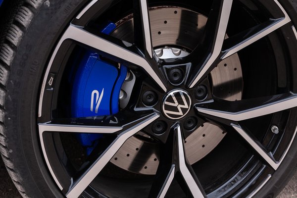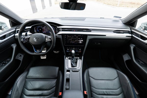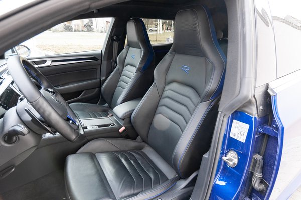 Nálunk a csúcs változat járt, amit egy R-betűvel jelöl a Volkswagen. Az Arteon R a kívülről elegáns vonalakat egy nagy adag brutalitással üti fel: hatalmas légbeömlők az első lökhárítókon, gigantikus - 20 colos és gyönyörű - felnik, óriási fékek, kékre fényezett féknyergek, a tető vonalát még inkább lefele húzó nagy hátsó szárny és hátul négy darab, nem túl diszkrét kipufogóvég. A külsőt a bevállalós szín kiválóan aláhúzza: ez a lilásba hajló, sötétkék-metál telitalálat.