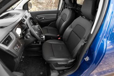 A vezető oldaláról tudok nyilatkozni: jól. Az Express a Dacia M0 platformjára épül, ami rokona a Clio platformnak, tehát azok a kényelmi és biztonsági cuccai ide is átköltözhetnek. Például lehet fejegységünk Android Autoval és Apple CarPlay-jel, rengeteg légzsák, keréknyomás ellenőrző, emelkedőn elindulást segítő rendszer, tolatókamera, holttérfigyelő, tempomat, ami kell. Ezek azok a dolgok, amikkel már nagyon jó az együttélés, de a sávtartóról például le kell mondani. Viszont legalább megmaradtak a rendes, analóg klímaszabályzók, amiért lassan tüntetéseket fogok tervezni, és még negyven liternyi tároló is akad elöl. Szintén ötletes megoldás az utasoldali napellenző sminktükrének helyére épített dombortükör: ha lehajtjuk, komolyan csökkenthető vele az autó holttere.