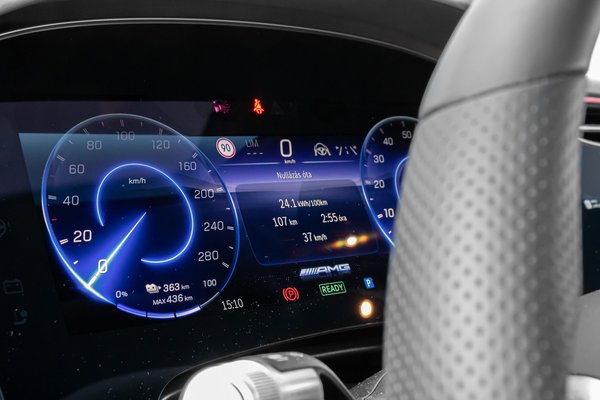 Irgalmatlan erő van benne, az AMG Plus Dynamic csomaggal ugyanis 761 lóerős teljesítmény és 1020 Nm nyomaték viszi a több mint 2,6 tonnás autót. Gázra azonnal pokoli módon meglendül az EQS, 3,4 másodperc alatt villan 100-ra, és ahogy a fejtámla dombornyomott AMG címerét a tarkómba préseli az ülés, el is hiszem neki. A hirtelen lecsapó szakadatlan gyorsulás mindig nagyon szórakoztató, de ezen kívül az EQS 53 nem adja meg azt a szűretlen macsós érzést, amitől az AMG-k annyira szerethető gépek.