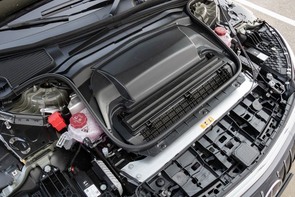 Annak ellenére, hogy az EQS már nem olyan belsőégésű alapokra épített villanyautó, mint az EQC vagy az EQB, nem igazán érezni, hogy kihasználták volna a több mint 5,2 méteres hosszt és a 3,2 méteres tengelytávot. Szellős az utastér, és ránézésre sem kicsi a csomagtartója (lehajtott ülésekkel simán elnyel egy termetesebb biciklit a kerék kiszerelése nélkül), de a töltőkábeleket is ide kell hajítani, mert az orrában nincs egy praktikus tároló. Helyette ott a 150 focipályának megfelelő felületű szűrő, ami a részecskék 99,65 százalékát megszűri, hogy a lehető legtisztább levegő legyen a kabinban.