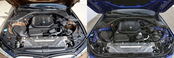 Természetesen a BMW nem rokkan bele abba, hogy a kicsi modelljei között fennmarad egy rendes hátsókerekes, a technika adott. Igaz, ennek a rövidke 2-es Coupénak már viccesen nagy lett az orra a testéhez képest, mert egy az egyben a hatalmasra nőtt 3-as sorozat elejét kaphatta meg. A költségcsökkentési részleg megnyugtatására újabb burkolatokat hagytak el a motortérből, úgyhogy ennek a 2-esnek aztán végképp puruttya a motortere, szabadon futó, szigetelőszalagba tekert, gyorskötözős kábelkötegekkel, pőrén meredező csomagtérnyitó bovdennel, a zárhidat és a hűtő tetejét összekötő fém toldólemezzel... nem gondoltam volna, hogy ilyesmit egy BMW orrában láthatok, a lenézett fronthajtásos 2-es Gran Coupé motortere ehhez képest egy iparművészeti remekmű. Persze a Lexus-fanok most kárörvendően megjegyezhetik, hogy legalább kevesebb burkolatot kell lebontani a szereléshez, de csak az irigység beszél belőlük!