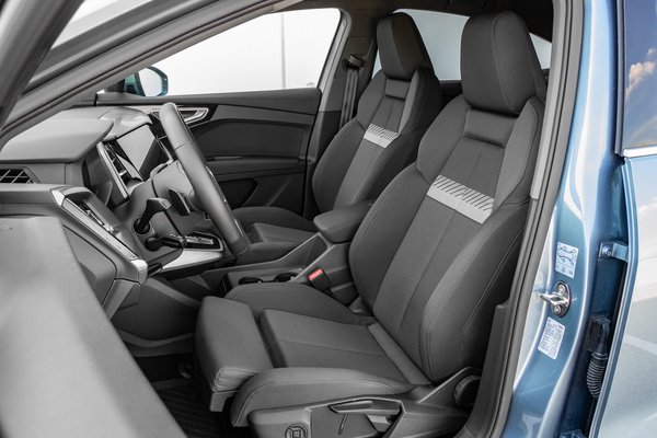Még ebben a Q4 e-tron Sportback 50 quattro-ban is kézzel állítható, szövetkárpitos ülések vannak, és a könyöklő előtt egy feleslegesen elpazarolt zongoralakk sziget, amin az irányválasztó tologatható, zongoralakk téglája ül. Ha a Multivanhoz hasonlóan ezt az érintőképernyő mellé rakják, akkor jobb helye volna itt a pohártartóknak és a telefonnak is, amiért egyébként egészen le kell nyújtózkodni a földszintre. Nevelő célzattal a vezetéknélküli töltő ráadásul lehetetlenné teszi a rápillantást.