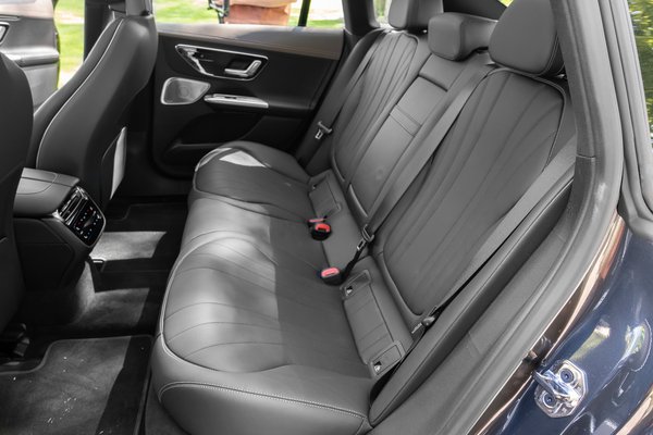 Az EQE hiába óriási minden szám mentén (kb 5x2 m), a szubjektív térérzete nem különösebben jó. Elöl a rohadt magas műszerfal és az alacsonyan induló tető szűkíti, és a hatalmas, mindent körülölelő műszerpult-középkonzol hegységlánc, hátul meg a tetőív ereszkedik nagyon, ezért fontos, hogy üvegből legyen. A hátsó üléssor villanyszedán-viszonylatban jó, hosszában tágas is, de ennek is magasabban van a padlója az igazán kényelmesnél, mint az összesnek (a Taycanon és az E-Tron GT-n kívül, amik máshogy szűkek).