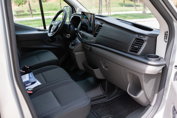 Az elmélet után következett a gyakorlat, végre elvihettük egy körre az E-Transitot. Belülre is jutott újdonság: a beltér ismerős, de sok ponton hozzányúltak, így például bekerült az új fedélzeti rendszert futtató, gigantikus központi kijelző. Az egész nagyon színes és szagos, a kijelző nem csak furgonhoz képest ad szép képet, de a rendszer nem keltett kész benyomást, sokszor döcögött. A régebbi rendszer viszont jól működött, így remélhetőleg ez javulni fog, mire eljut az autó a felhasználókhoz. A váltókar ezúttal egy tekerhető darab, ami sok Fordból lehet ismerős: ilyen van egy ideje például a Focusban és az Explorerben is.
