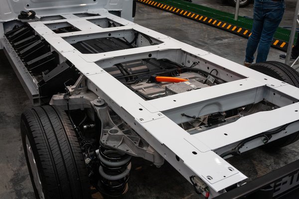 Az akkucsomag kapott maga köré egy fémkeretet, hogy akkor is védve maradjon, ha kemény padkázások vagy necces helyek hoznák kínos helyzetbe a Transit alját. Mindez a platós változaton csodásan megszemlélhető, abból ugyanis hoztak olyat, amin semmilyen felépítmény nem volt, így az akkucsomag és a hajtás is látható volt. Az akkumulátorcsomag egy az egyben a Mustang Mach-E kisebb akksis változatából érkezett, míg a motor egyedi fejlesztés.
