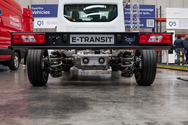 Érdekesség, hogy a belsőégésű változatot kétféle padlólemezzel gyártották: az elsőkerekes verzió alacsonyabb padlót kapott, a motorját pedig keresztben építették be, míg a hátóskerekesek és összkerekesek magasabb raktérpadlóval készültek, és ezekbe a motor is hosszában került be. Az E-Transit a hátsókerekes változat padlólemezét kapta, így azzal teljesen megegyeznek a belső méretei. Az eddigiekhez képest újdonság, hogy a hátsó futóművet lecserélték: hátul független felfüggesztést és tekercsrugókat kapott. Az új furgon hátsókerékhajtású, amit egy darab elektromotorral oldottak meg, ez a két hátsó kerék között helyezkedik el. Itt akadt még pár mérnöki túlóra: a motor a tengely vonalában van, amin átmegy a kihajtás, így nem kellett a raktérből elvenni extra helyet.