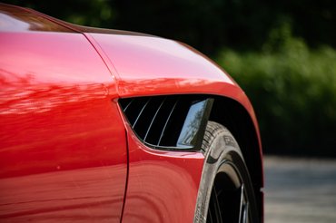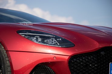 Nehéz volna ennél szebb orrmotoros sportautót mondani, a DBS-nek nincs előnytelen szöge, mindenhonnan és minden távolságból baljós, elegáns és gyönyörű. A Hyper red nevű piros metál fényezés a bordélyházi bordótól a frivol cukorkavörösig játszik a karosszériáján, legyen nyári napsütésben vagy a város éjszakai fényei alatt. Szemben állok vele és elterül előttem a hatalmas géptető, majd a távolban lapos szögben álló szélvédő mögött a kabin, aztán pedig a rövid far a hetyke spoilerrel. Nem olyan gyúrósan izmosak rajta a lemezek, mint a Maserati Shamalon, hanem inkább olyan funkcionális izom ez, mint a szálkás élsportolóké, a kerekek felett domborodik, de derékban hirtelen az örök szépségideálhoz szűkül.