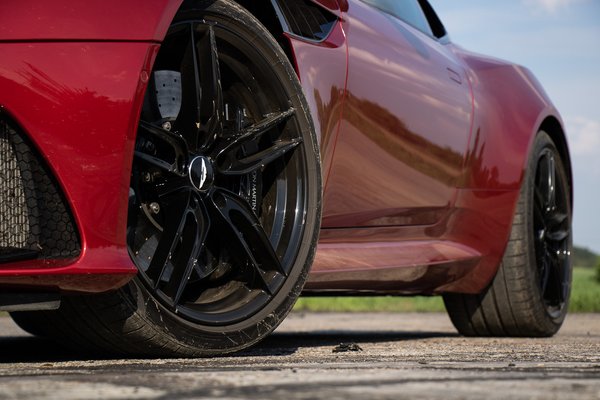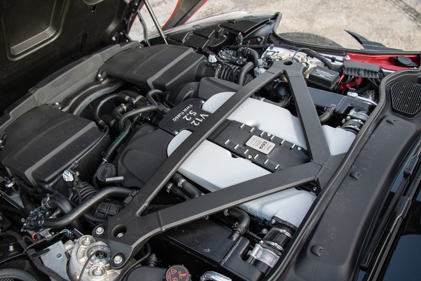 Előrebukik a motorháztető, és a vaskos merevítők alatt maradéktalanul kitölti a teret az Aston Martin 5,2 literes, biturbó V12-ese. A tengelyvonal mögé tolt blokkot a légszűrőházak és a pőre kerekek fogják közre, a fedetlenül futkosó csövekkel együtt rendesen versenyautós a DBS géptere. A 6500-as fordulaton 725 lóerőt kiüvöltő 12 hengeres motor alapjait a ‘90-es években megjelent Ford Duratec V6-osa adja, melyben vastagon benne van a Cosworth mérnökeinek munkája. Szénszálas kardántengely fut hátra a 8 sebességes ZF automataváltóhoz (transaxle elrendezés).
