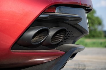 Hatalmas légbeömlői alatt, a lökhárító alján ott figyel a karbon splitter, a kerékjáratokból pedig kifelé fésült lamellák vezetik ki a levegőt, de a küszöb élére rátakaró első sárvédő is mutatós megoldás. Ez még mind csak ízelítő, mert a hátsó tetőoszlop előbb befelé kanyarodó ablak mellett bebukik a levegő és egy csatornán át a csomagtérfedélen keresztül a szénszálas hátsó szárnyacskánál bukkan ki. Ezek mellett még teljesen burkolt a DBS alja és diffúzor is került az ágyú méretű dupla kipufogócsövek közé. Végsebességénél 180 kg leszorítóerőt termel ez a temérdek trükk. Elképesztő, hogy csak a részletein látszik igazán, mennyi munkaóra telt a szélcsatornában.