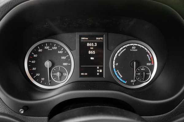 A műszerfalon a sebesség mellett az akkumulátor töltöttségét és a pillanatnyi energiafelhasználást, illetve a visszatáplálást követhetjük figyelemmel, illetve látjuk a hátra lévő hatótávot. Ezzel a fedélzeti számítógép nagyvonalúan számol, 100%-ra töltve 265 kilométert ígér, ami városban, óvatos vezetés mellett akár 220 kilométer is meglehet, aztán ahogy elhagyjuk a várostáblát, a nagy homlokfelület miatt drasztikusan elkezd csökkenni a hatótáv. A 120 km/h-s korlátozás előrevetíti, hogy nem az eVito lesz az autópályák ragadozója, ugyanakkor ha nem a termelékenység az elsődleges, vidéki fuvart is le lehet vele tudni. Úgy alakult, hogy a tesztautóval lerendeztem egy vidéki fuvart, úgynevezett cuccokat és motyókat kellett elhoznom Békés megyéből. Ez az a fajta használat, amire az elektromos hajtás kevésbé alkalmas. A katalógusadatokat átböngészve (116 lóerő, 120 km/h-s limit) is egyértelmű, hogy nem erre szánták.
