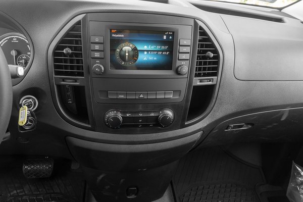 A kilátás a vaskos A-oszlop ellenére is jó, a tolatást pedig kamera segíti - a középkonzolon lévő 7 collos kijelző felbontása nem hozza egy olcsóbb tablet szintjét sem, ami leginkább a 20 milliós vételár tükrében kellemetlen, de egyébként a célnak megfelel. Képes a telefont tükrözni az Apple Carplay vagy az Android Auto segítségével, lehet menedzselni a bejövő és kimenő hívásokat - ami egy munkaautónál különösen fontos.