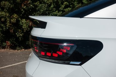 Az igazi izgalom az oldalnézet, amit alapvetően meghatároz az A oszlopot a C oszloppal összekötő tetőív. Ez első látásra a két típuson teljesen azonosnak tűnik, ami azt is jelentené, hogy tetőik íve is azonos, ami majdnem igaz is! Az ID.4 hátulja csak azért néz ki meredekebbnek, mert hátsó szélvédőjét oldalról is tömör tetőspojler keretezi. Az ID.5 hátsó szélvédője ellenben önmagában lejt hátrafelé, és légellenállási alaktényezőjét 0,28-ról 0,26-ra csökkentő hátsó szárnyát nem ennek tetején, hanem tövében hordja. Hátulnézetből is az ID.5 hátsó szárnya a legbiztosabb ismertetőjel, a hátsó lámpák tetejéig ugyanis a két típus tökéletesen egyforma.