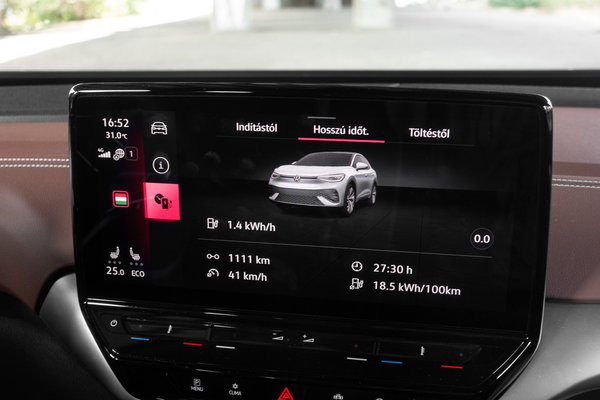 Nemcsak ez nem egészen minőségi azonban, hanem az egész utastér anyagválasztása sem az. Igaz, ez nem túl szembeötlő, hiszen elektromos autóknál megszokott, hogy a drága műszaki tartalmat többek között olcsóbb műanyagokkal ellensúlyozzák. Az ID.5 kemény műanyagai ráadásul szemre jól mutatnak, a problémát ezért inkább az jelenti, hogy ugyanebben az árkategóriában immár kínálnak minőségibb belterű típusokat is. Csak, hogy egyet említsek, ilyen például a Hyundai Ioniq 5. Mindez azonban csak a próbált Pro kivitelű modellről mondható el, a drágább, erőteljesebb, elöl-hátul motoros és így összkerékhajtásos GTX állítólag igényesebb belül.