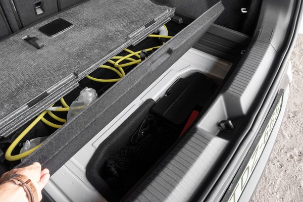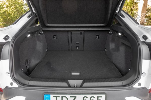 Még egy meglepetést rejt a sportosabb kinézetű ID.5 hátulja az ID.4-hez képest. Meglepő módon alaphelyzetben nagyobb a csomagtartója. Igaz, csak hat literrel, de akkor is nagyobb. A gyárilag megadott 549 literes befogadóképességet azonban úgy kell érteni, hogy abba a padló alatti, és az az alatti rekesz is beleszámít. A közvetlenül a padló alatti leginkább a töltőkábelek és pár egyéb, laposabb tárgy tárolására alkalmas, a mínusz kettőben pedig a csomagtér-elválasztó háló és a gumijavító készlet lakik. A maradék körülbelül 450 liter sem kevés ugyan, de egy 4,6 méter hosszú, 1,6 méter magas SUV-ban nem számít soknak. A csomagtartó teljes kapacitásának kihasználására lehetőséget nyújt a köztes padló otthonhagyása, de akkor hova tesszük a töltőkábeleket?
