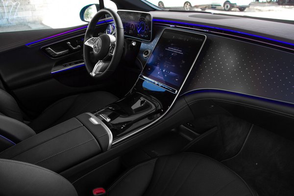 Érdekes, hogy az EQE-nek nincs dizájnja, már ha a dizájn alatt azt értjük, hogy a szemnek valami kellemes tárgy keletkezzen. Ezt a formát a szélcsatorna rajzolta, mindent a hatótávnak és a hatékonyságnak rendeltek alá. A szélvédő például olyan lapos, hogy a szenzorsziget miatt sokszor nem látszik a jelzőlámpa, szerencsére az autó felismeri, ha állunk a pirosnál, és élőképen mutatja nekünk középen a kereszteződést, nem kell hajolgatni. Viszont, ha már szenzorok: a vezetéssegítők baromi ügyesek, itt emelném ki a fényszóró azon funkcióját, ami éjszaka ábrákat rajzol az autónk elé a többi közlekedő tájékoztatására sávváltásnál, vagy a követési távolság csökkenésénél.