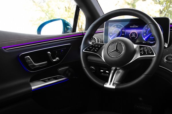 Szintén téboly az összkerék-kormányzás, a hátsó kerekek 10 fokot fordulnak, ami elég arra, hogy ha valahol kitekert kormánnyal hagyjuk ott, a haver szóljon, hogy odacsaptuk a hátsó futóművet. 10,9 méter a fordulóköre, ami kisebb mint egy Ford Fiestáé, pedig az EQE tengelytávja akkora mint egy S osztályé. Ez a gyakorlatban azt jelenti, hogy a rövid túlnyúlások és a nagy hátsó kormánykitérés miatt nekem újra kellett tanulnom parkolni, ugyanis az első pár jobbra hátra parkolásnál majdnem beletoltam az oldalát a mellettem állóba. Ezzel együtt is olyan könnyedén kezelhető, ami sok kompaktnak nem jön össze. A tengelytáv miatt viszont nem árt figyelni, mert hiába nem alacsony a kaszni, könnyen leérhet szerényebb padkán is, nem hiába emelhető a magassága.