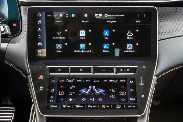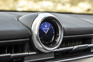 Az új idők új szelét jelzi, hogy a Maseratik korábbi ékét, a műszerfal közepének tetején trónoló analóg órát okosóra váltotta fel, ami többféle időkijelzés mellett a hossz- és oldalgyorsulásokat, a fék és gázhasználatot is mutathatja, de akár iránytűt is megjeleníthetünk rajta. Átállítása a két középső érintőképernyő közül a 22 centi átlójú alsón lehetséges. Ezen lehet egyébként minden kényelmi funkciót, így a klímát vagy a hangulatvilágítást is átállítani. Ami elsőre furcsa, hogy a fényszórót is ezen az érintőképernyőn lehet kapcsolgatni, mert külön lámpakapcsoló nincs. Egyedül reflektorra lehet máshol, a jobboldali bajuszkapcsoló előretolásával átkapcsolni. Szintén érdekes az ajtó nyomógombos nyitása, pontosabban az az érdekes benne, hogy éppen olyan, mint az elektromos Fiat 500-é. Még a mechanikusan működő szükségnyitó elhelyezése is azonos.