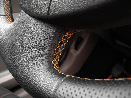 Szintén esztétikai beavatkozást igényelt a kormány „bőrözése.” Az idézőjel nem véletlen: ebben az évjáratban a Renault-k kormányát és váltógombját valami vidrabőrrel húzták be, ami pár év múlva garantáltan elkezdett lefoszlani, mint leégett vállról a bőr. Hát ezért volt a hirdetési képen a randa piros kormányvédő! Ha nem is ápolt, de legalább eltakart. Ha már újra kellett bőrözni a kormányt, legalább dögös perforált bőrt kapott, az ülés szegéséhez is használt narancssárga öltéssel.
