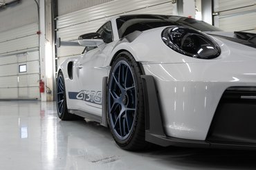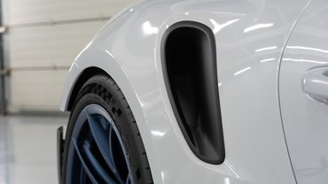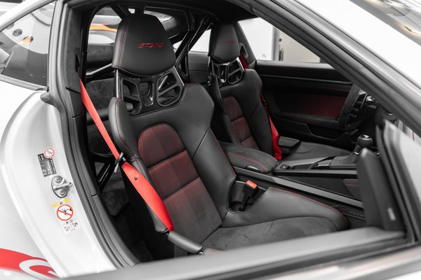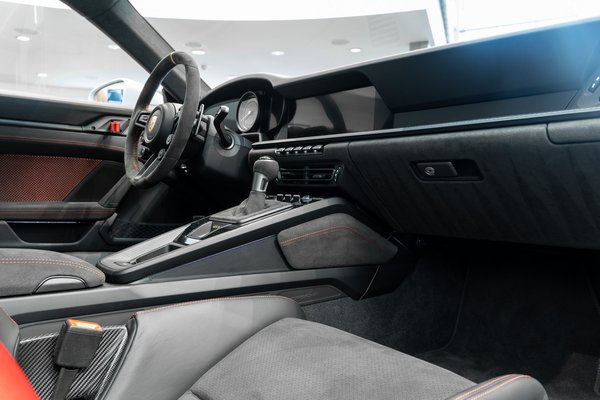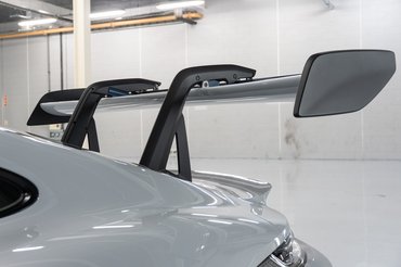 Például ott a motor: egy négyliteres szívó, természetesen bokszer, finoman módosított szívócsatornákkal, hosszabb szelepnyitást lehetővé tevő vezérműtengelyekkel, épp csak 15 lóerőnyi növekménnyel egy GT3-hoz képest. Ez most 525 lóerős, vagyis literenként több mint 130, kétlem, hogy az utcai regulációk megtartásával ennél feljebb tudnának menni. Aztán ott az aerodinamika: ez az autó 285-nél 860 kiló leszorítóerőt termel, emiatt a sima GT3-hoz képest 50%-kal keményebb rugókat kellett beépíteni. A kaszni szétszabdalásának problémájáról már írtam, de vélhetően a vulgáris méretű aktív szárny is azért ekkora, mert a szabályozás ennyit enged. Nem egy Viper ACR szint, tehát aludni nem lehet rajta, de egy háromfős család kényelmesen elnyammogja róla a papírtálcás wurstot, mustárral, fehér kenyérrel.