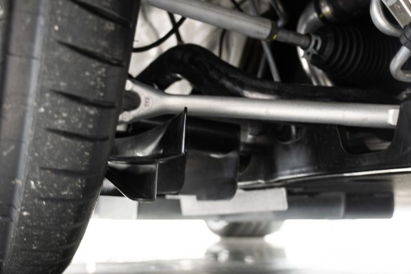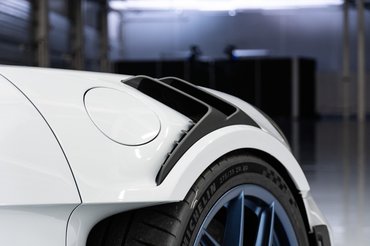 Letaglózó színpadi jelenléte van az autónak, sziluettjében hiába látni egy 911-es Porschét, nem tudom, hogy van-e lemez, ami csereszabatos lenne akár csak egy GT3-mal is. Matthias szerint a kaszni minden kivágása akkora, amit a törvényi szabályozás megenged. Ott van például az első kerék mögötti kerékív: a kerék hátsó harmadánál egyszerűen eltűnik, egy csatorna nyílik, hogy távozni tudjon a levegő az első futóműből. Nem lehet akármekkorára vágni, hiszen kivágódik a törmelék, ami veszélyes, de ekkorára még pont ki lehet nyitni, ki is nyitották. De hogy miért kell mindez? Mert még az első futómű lengőkarjai is aerodinamikailag optimalizáltak.