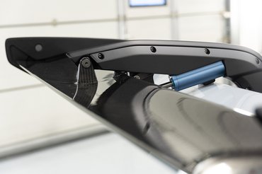 Az aero-rendszer főszereplője persze a hátsó szárny, ami a típus történetében először magasabb mint az autó tetővonala. Hattyúnyak-megoldást választottak, vagyis a szárnyat nem alulról támasztja a kompozit konzol, hanem felülről, ezzel is növelve a hasznos, alsó felületet. Őrületes erők ébrednek itt, a burkolatra való felfogatás szóba sem jöhetett, a két konzol egy szénszálas bölcsőbe fogatva rögzül a kasznin belül. A hátsó szárny felülete két elemből áll, egy nagyobb, fix lap, és a kisebb, aktív elem, amelyet két hidraulikus munkahenger mozgat, ezek szivattyúja szintén a már emlegetett szénszálas bölcsőben ül. Az aktív elemek mozgatása mindössze 0,3 másodperc alatt megtörténik, a leszorítóerőt pedig 30-70 arányban osztották el a hátsó tengely javára.