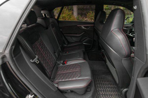Az RS Q8 5 méter hosszú, a tengelytávja 3 méter, mindezek mellé pedig 2 méter széles. Így aztán természetes, hogy elöl és hátul is hatalmas a hely. Hátul az az egyetlen probléma, hogy a kardánalagút nagyon magas és széles, ezért csak négy embernek igazán kényelmes. Itt amúgy elektromosan nyitható rolók vannak, illetve vicces, de mindkét hátsó ajtón két ablakemelő kapcsoló van, így mindkét oldali ablak vezérelhető mindkét oldalról.