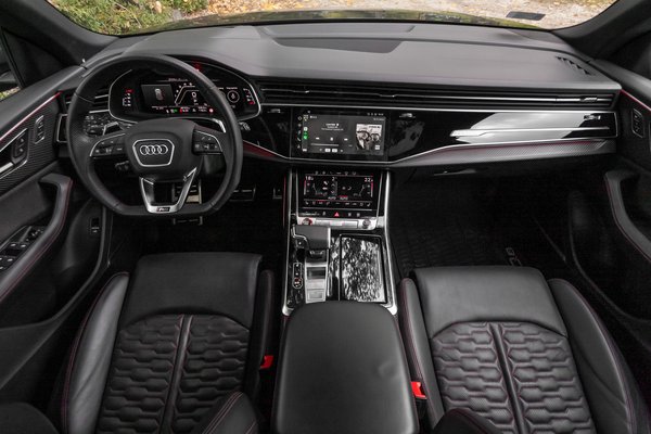 Belül igazi hűvös, németes sportosságot kap a júzer: ahogy a mai Audikban megszokott, minden szögletes, egyenes, éles és szigorú. A tesztautóban majdnem minden fekete volt, amit krómmal, ezüsttel és pirossal ütöttek fel. Ez a színkombó lehetne akár reménytelenül komor is, de ebben az esetben ez tökéletesen passzolt az RS Q8 karakteréhez. A sok zongoralakkért azonban kár, mert ebben a relatíve sokat futott – közel 50 ezer kilométer volt benne – tesztautóban már nagyon látványosan karcos volt mindenhol, ahol hozzá lehet érni.