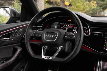 Ezen a szinten semmi meglepő nincs benne, hogy az anyagok igényesek, a bőrök igaziak és az összeszerelési minőség is példás. Legalábbis papírforma szerint, ugyanakkor ötvenezer harcos kilométer után pár helyen már kezdett fáradni a beltér. A legdurvább a könyöklő volt, ami iszonyú hangosan nyikorgott már, de az ajtókárpitok teteje se maradt hangtalan. Kár ezekért, mert nagyon elrontják azt a prémiumautós érzést, amit egy ilyen gyártótól bárki elvárna. Az viszont nagy pozitívum, hogy a négy keret nélküli ablak ellenére sem fütyült benne a szél. Mondjuk ez köszönhető volt a dupla üvegezésnek is, ami azt is hozta magával, hogy az RS Q8 hamarabb eléri állórajtból a 100-at, mint hogy felhúzná a vezetőoldali ablakát.