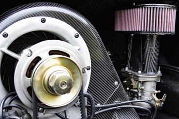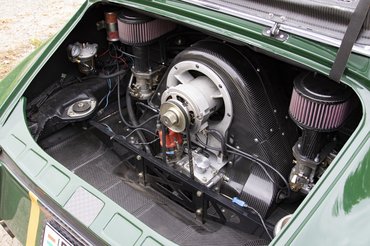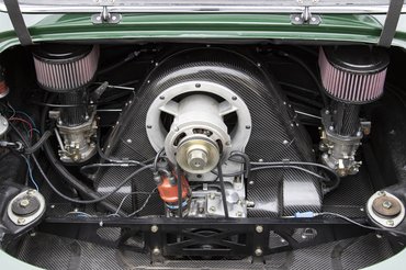 A veterános dimenziók ellenére szénszálas elemek vesznek körül, a motor pedig egy modern mestermű. A 356C 1.6-os motorja kétliteresre hizlalva, durván 170 lóerővel 6800-as fordulaton. A tiltás valahol 7,200 környékén jön, hiszen a módosításoktól függetlenül egy nyomórudas boxermotorról beszélünk.